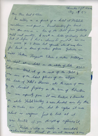 “Today we toured all of the North of the Galil….. also the scene of some of the hardest fighting in the War of Liberation. It was British and dominated the whole Huleh Valley and was handed by them and the Arabs. We then had to capture it with almost no weapons.”