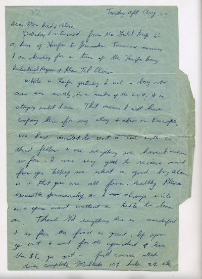 We have decided to rent a car with a third fellow & see everything we haven’t seen so far. I was very glad to receive mail from you telling me what a good boy Alan is and that you are all fine and healthy. Please excuse the penmanship as I always write in a spare moment without a table to lean on. Thank G-d everything here is wonderful & so far the food is great.