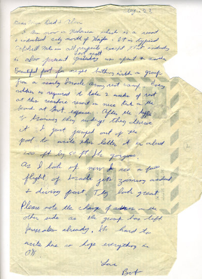 I am now in Naharia which is a resort & industrial city North of Haifa. It is typical Catskill Mountains in all respects except that industry is also present. Last night was spent in another beautiful pool for night bathing with a group from a nearby Israeli army rest camp. Every soldier is required to take 2 weeks of rest at the seashore resort in nice tents on the beach at Government expense. After the type of training they underwent they deserve it. I just jumped out of the pool to write this letter. IT IS ABOUT 200 FT. BY 50 FT. It’s gorgeous.