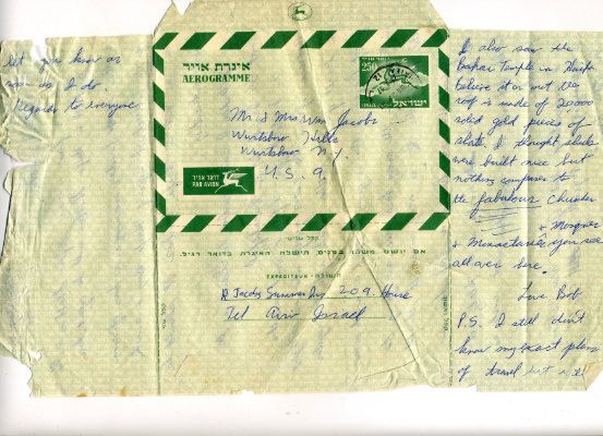 “As I told you before I met another American from the ZOA group who is staying in Israel for a little while after the regular group leaves & then is going to spend a week or so in Europe on the way back. We are going to do this together. He is very nice and it should be great. We are hiring a jeep here & an Israeli who works in the Heletz oil fields, but will be on vacation next week is going also.”