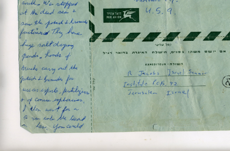 He wrote two letters to his parents in one day. The number of places he saw in one day is a story in itself. I have read many books on Israel and I have not read any book that gives detailed descriptions about the Negev, the Dead Sea, Beer Sheva the Jerusalem, Tel Aviv, kibbutzim and the northern part of the country etc., as my father did in his letters. Bob also described the factories and natural resources in each place.