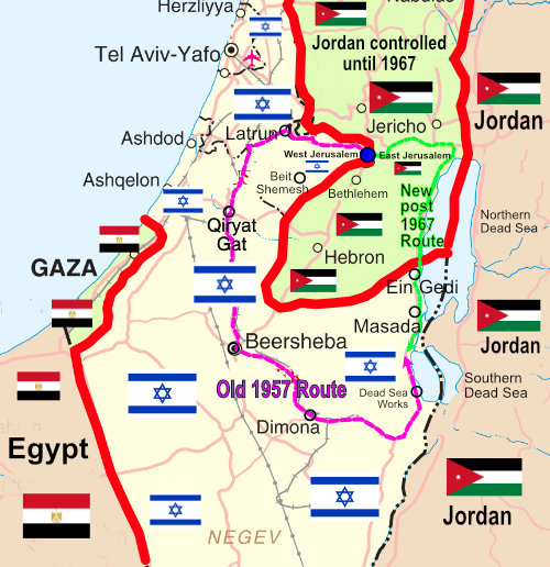 (In 1957 Judea and Samaria – also known as the West Bank – was controlled by Jordan and one could not travel directly east from Jerusalem to the Dead Sea.)