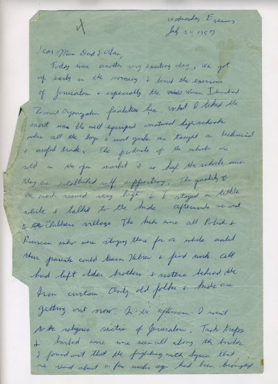 Today was another very exciting day. We got up early in the morning and toured the environs of Jerusalem and especially the Women International Zionist Organization facilities here. What I liked the most was the well-equipped vocational high schools where all the boys and most girls are taught a technical trade. The products of the schools are sold on the open market and so help the schools once they are established self-supporting. The quality of the work seemed very high and I stayed a little while and talked to the kids. Afterwards we went to the Children’s Village.