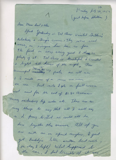 Last night. I ate a full course meat meal for the cost of $1.80 American money including tip soda etc. There are so many things to say that all I will say is I pray to G-D we could all be here together this summer. All of you are with me in spirit anyhow. I just got Daddy’s letter written last week. (the day I left ) What happened to the car? I feel terrible if it was my fault on Bay Parkway on July 19 .