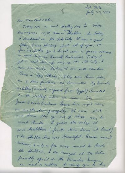 As far as clothes go I haven’t seen anyone wearing a suit, not even in Israel’s Parliament. Today I got a real close up view of the old City. I even saw Arabs looking at us with machine guns and Spy Glasses. They were lower than us and their positions are dominated by Israeli Artillery, (recently acquired from Egypt) located on the Hilltop where we were. The Jewish and Arab Civilians live right near one another here peacefully. It seems that since Sinai, they go out of their way to avoid trouble. I guess they realize it is healthier (for the time being at least).