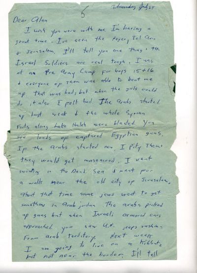 I’ll tell you one thing. When you see Israel & the boys & girls of the army you can be real proud you are a Jew. Don’t worry they could lick all the Arabs together easy.
