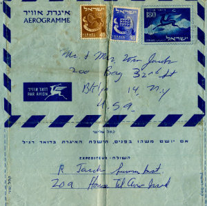 In 1957 when Bob heard that the ZOA was organizing summer trips to Israel, he decided to fly to Israel and surprise his girlfriend Elaine who was in Israel on a trip with Young Hadassah. This 1957 trip to Israel which was my father’s first trip to Israel had a profound effect on my father. He built a stronger bond with the State of Israel and a stronger bond with his girlfriend Elaine later my mom. The ZOA first trip to Israel was one of the most important things effecting my father’s life. By the 38 letters that my father wrote one could see how organized the trip was.